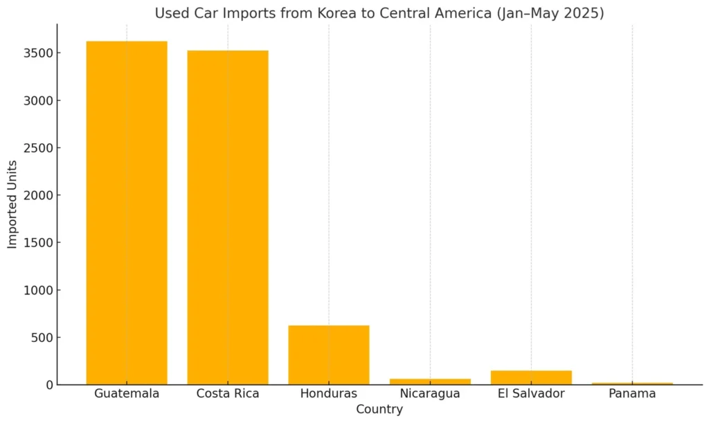 Alt Text: Bar chart showing Korean used car imports to Central America in Jan–May 2025