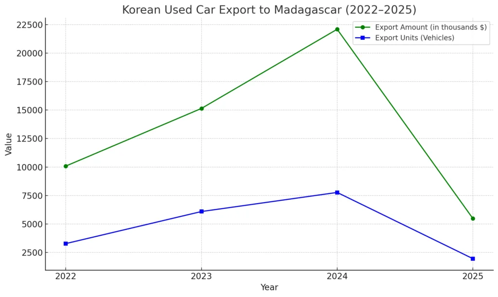 It is important to note that the 2025 data covers just the first five months, which partially explains the drop in Korean used car export to Madagascar volume and value.